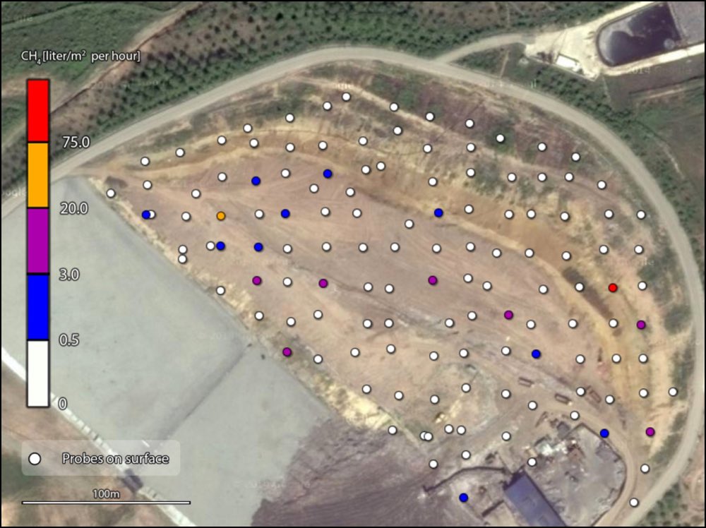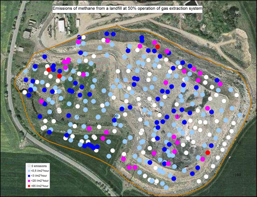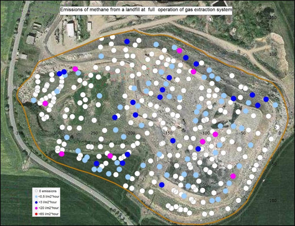 Surface emissions of methane were measured using flux-scan sampling device and ECOPROBE 5 portable gas analyser. The outcomes of surface emissions measurement were combined with measurement of LFG quality in the LFG extraction system, composed of a number of sets of horizontal LFG extraction pipes. Surface emissions measurement were used for determination of efficacy of LFG extraction from the landfill and identification of areas with methane leaks and/or inefficient gas extraction.